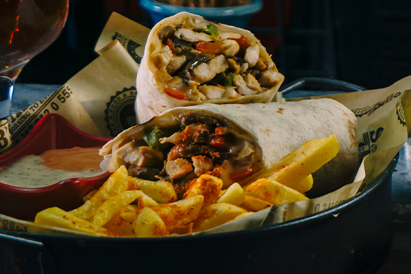 Tortilla arasına 150 gr tavuk, biber, mantar, kaşar peyniri.Yanında parmak patates ile servis. Soya soslu.